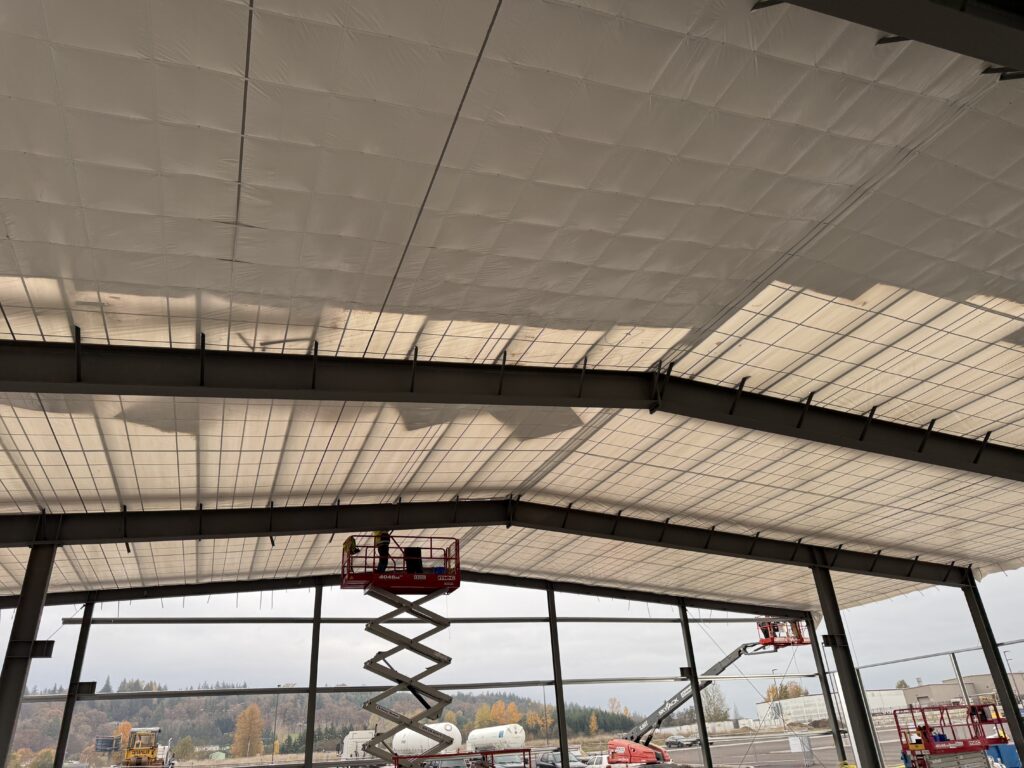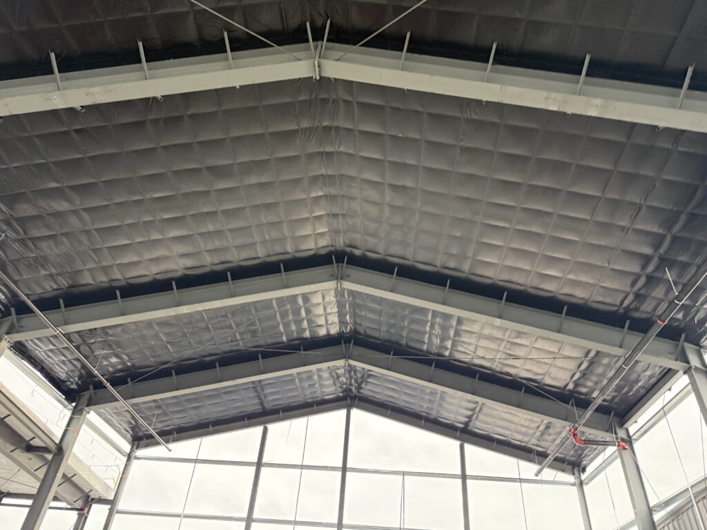 The metal roofing was installed over batt insulation that is supported by the Simple Saver system. The insulation is held in place by a gridwork of tensioned steel straps. In this application, our client elected to double the number of straps so they are closer spaced. In addition to acting as OSHA approved fall protection during construction, the straps hold the insulation tight in place at the decking for the life of the roof.